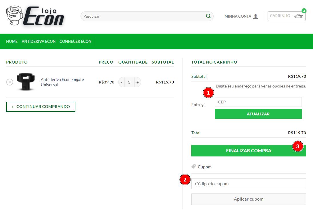 Ao acessar o carrinho poderá simular o frete no item 1 informando seu cep e clicando em ATUALIZAR, no tem 2 poderá aplicar o cupom de desconto e por ultimo clicar em FINALIZAR COMPRA para concluir seu pedido.